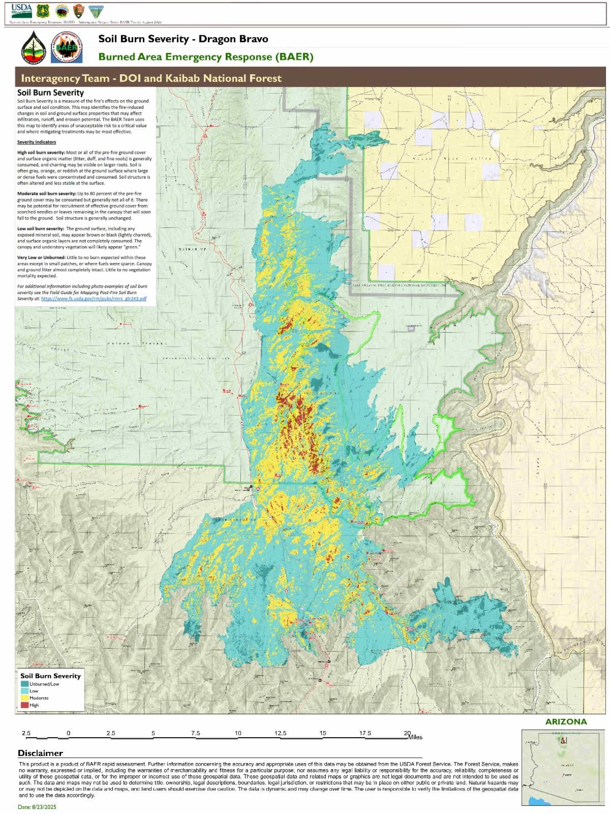 The Dragon Bravo BAER teams used remote sensing imagery with field-validated soils data to produce the final SBS map, which serves as an analysis tool to estimate post-fire erosion with subsequent sediment delivery, stream flows and debris flow probabilities. The SBS map and more information on the DOI BAER Team efforts at Grand Canyon National Park and on BLM Arizona Strip Field Office lands are available on DOI BAER DOI BAER InciWeb. Additionally, updates regarding the USFS BAER Team efforts on the Kaibab National Forest are available on a separate USFS BAER InciWeb page.