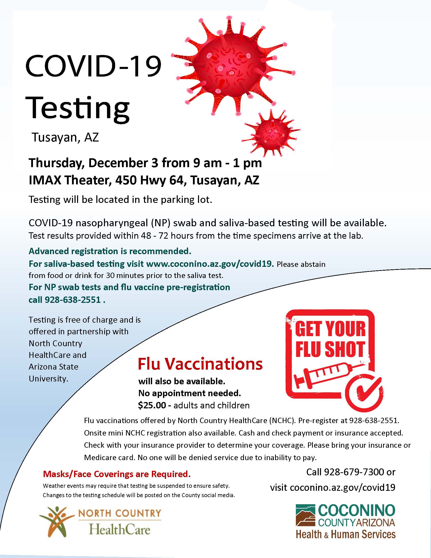 The 4th round of Tusayan COVID-19 Testing will be conducted tomorrow (December 3rd) at the IMAX.