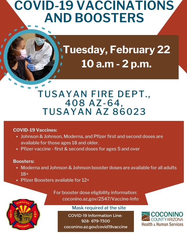 The Tusayan Fire department is hosing a COVID vaccination clinic on Tuesday, February 22nd, from 10:00am to 2:00pm. the location is the Tusayan Fire Department, 408 AZ State Highway 64 [between IMAX and Wendy’s in Tusayan].