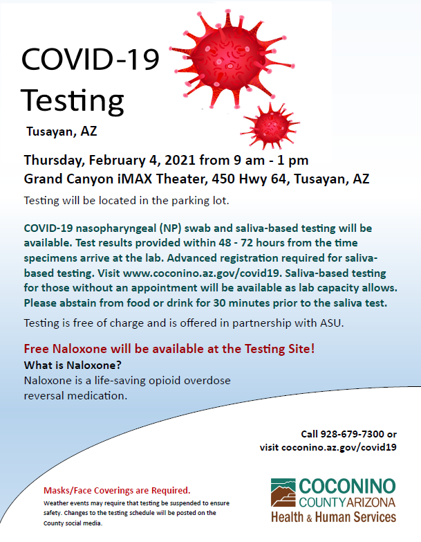 *On Thursday, February 4th, COVID-19 testing will be available at the IMAX back parking lot from 9:00 am – 1:00 pm. Saliva and Nasal Swab testing will be available.