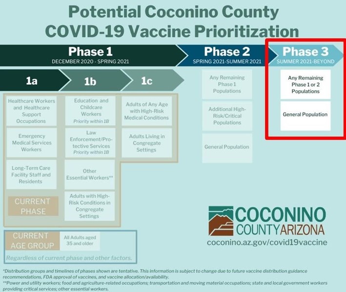 *This month’s COVID-19 vaccine update – Coconino County and the State of Arizona are opening vaccinations to all persons 16 years of age and up. Moderna and Johnson and Johnson vaccines are only available for adults 18 and up. Pfizer vaccines are available to individuals 16 and up. There are vaccine appointments available at various locations throughout the county.