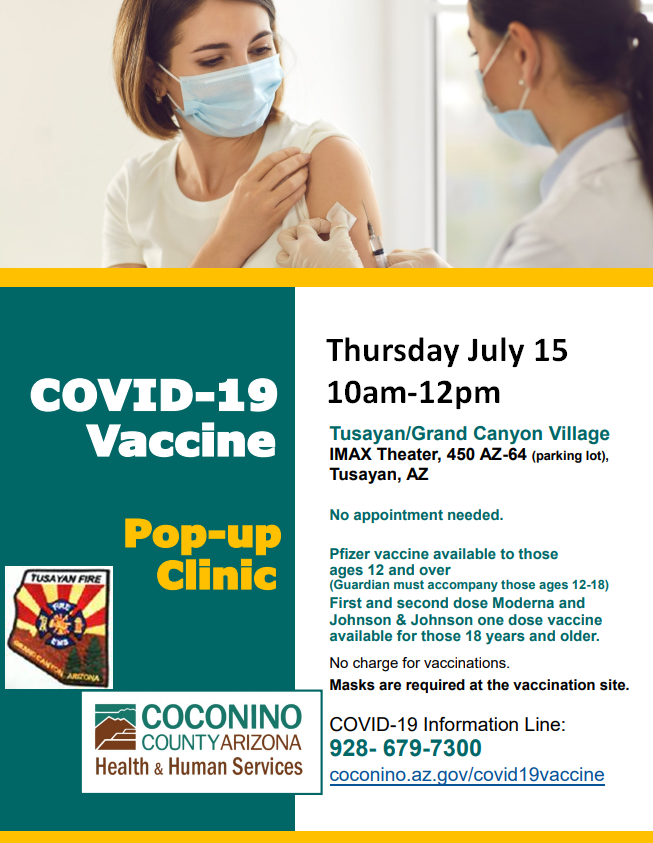 This Thursday (7/15/21) at 10:00am-12:00pm is the next Tusayan Vaccine Event at the IMAX.