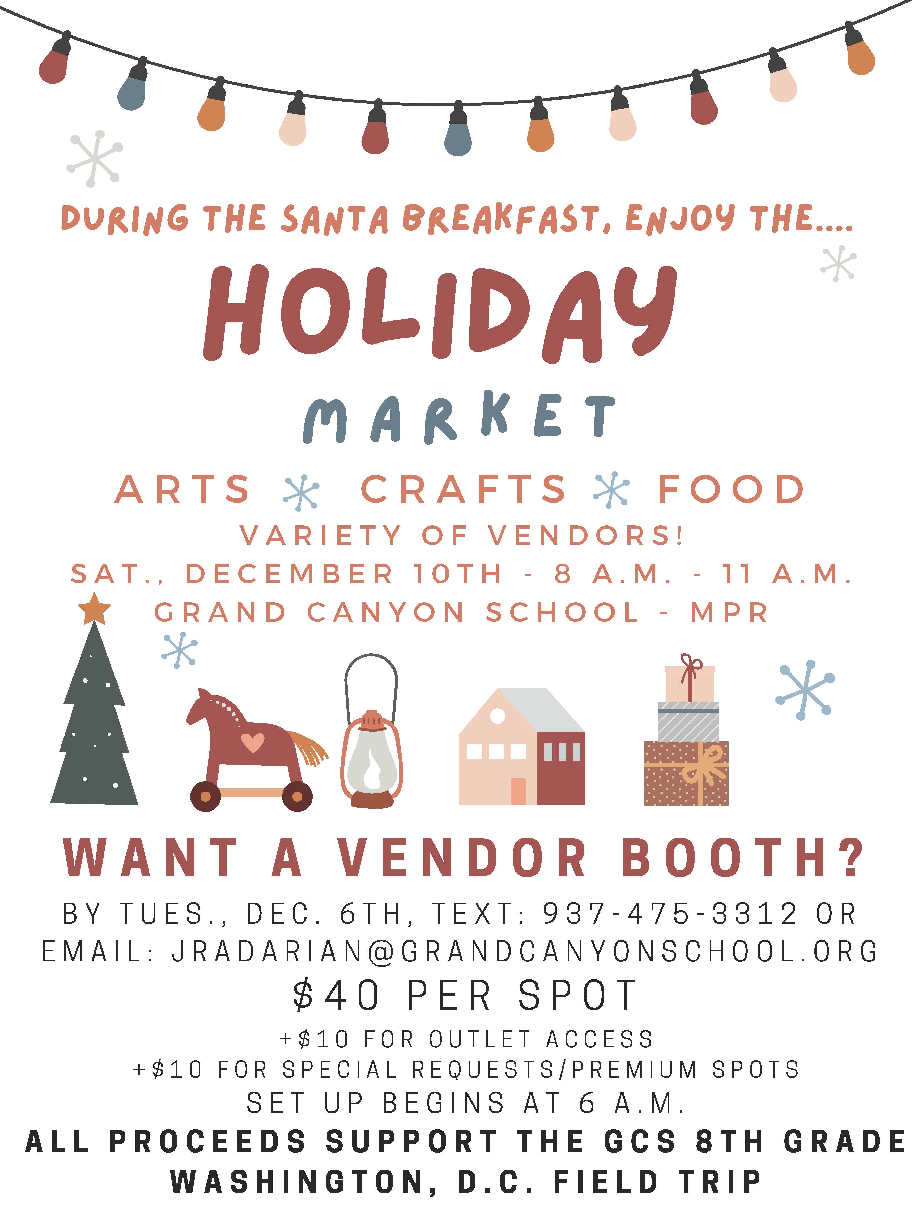 The Grand Canyon School is announcing a Holiday Market and Santa Breakfast taking place at the school Multi-purpose Room on December 10 from 8-11 a.m.