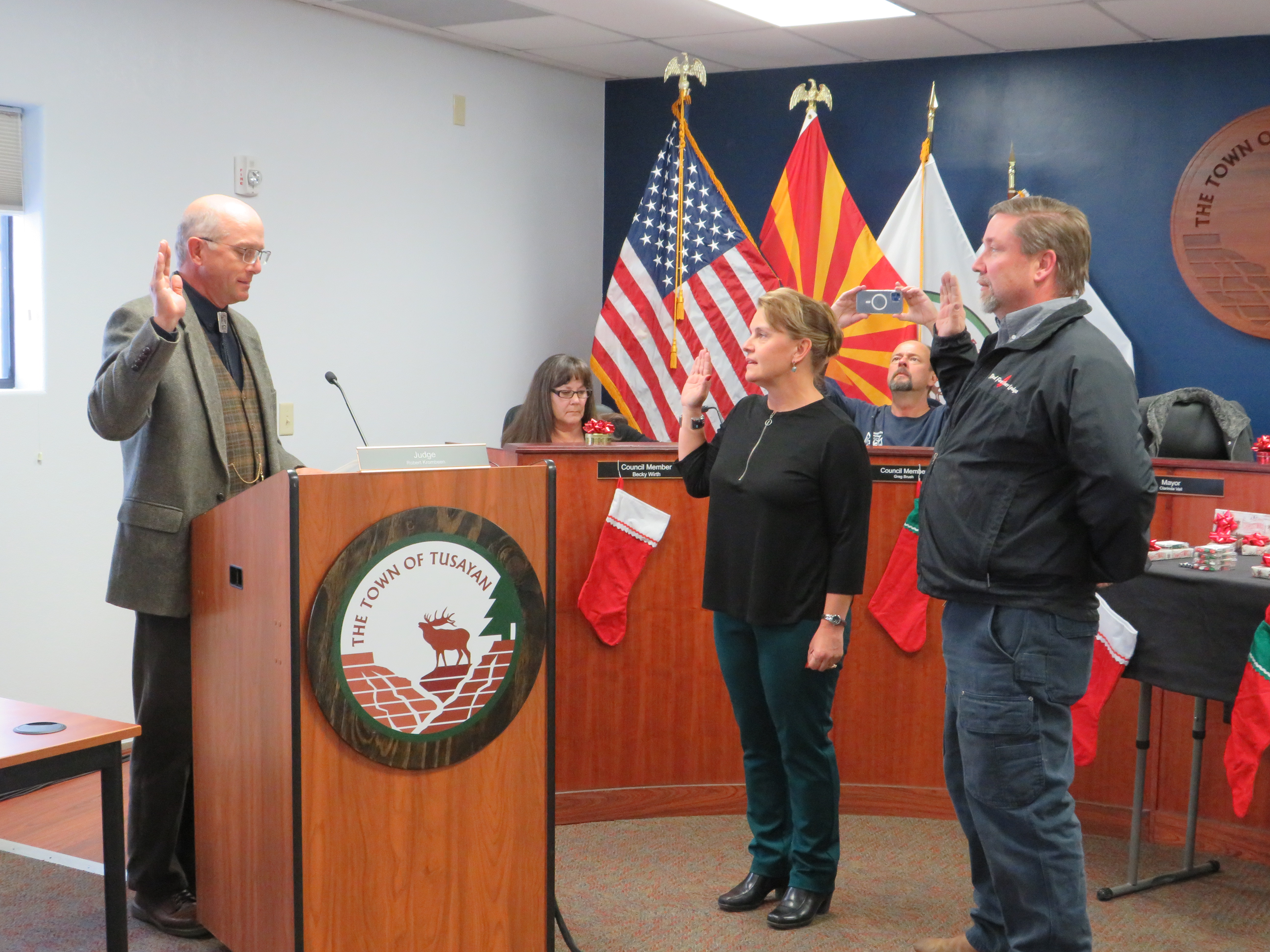 Tusayan Mayor Clarinda Vail has started her second term as Mayor as has Councilmember Greg Brush. Town Council newcomer Josh Collet has started his first term. All there were sworn in at a ceremony December 14th. The meeting also saw the departure of outgoing Tusayan Vice Mayor Brady Harris and Councilmember Robb Baldosky. Both were honored for their four years of service on the Tusayan Town Council.