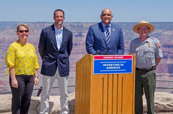 National Park Service Photo, Left to right: Tusayan Mayor Clarinda Vail, Deputy Assistant Secretary for Fish and Wildlife and Parks Matt Strickler, Federal Highways Administrator Shailen Bhatt, and Grand Canyon National Park Superintendent Ed Keable during the July 6 announcement at Hopi Point.
