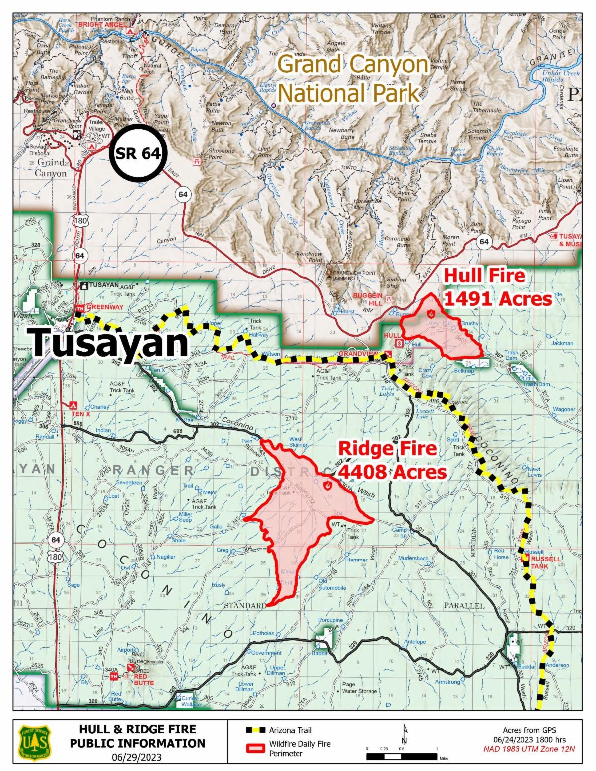 Three Lakes Fire: 5,146 acres with slow growth within the planning area. Some short-term smoke impacts to State Route 67 are possible. Motorists should be prepared to slow down or briefly stop. Fire Managers are coordinating with Arizona Department of Transportation and pilot cars may be used if necessary.