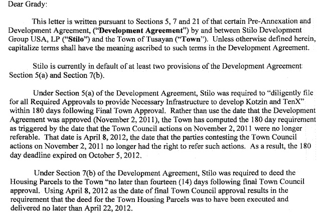 According to the default letter the land was supposed to be handed over in April of 2012. If residents of Tusayan knew that key promise would be broken, Stilo might have never been handed its rezoning nearly two years ago.