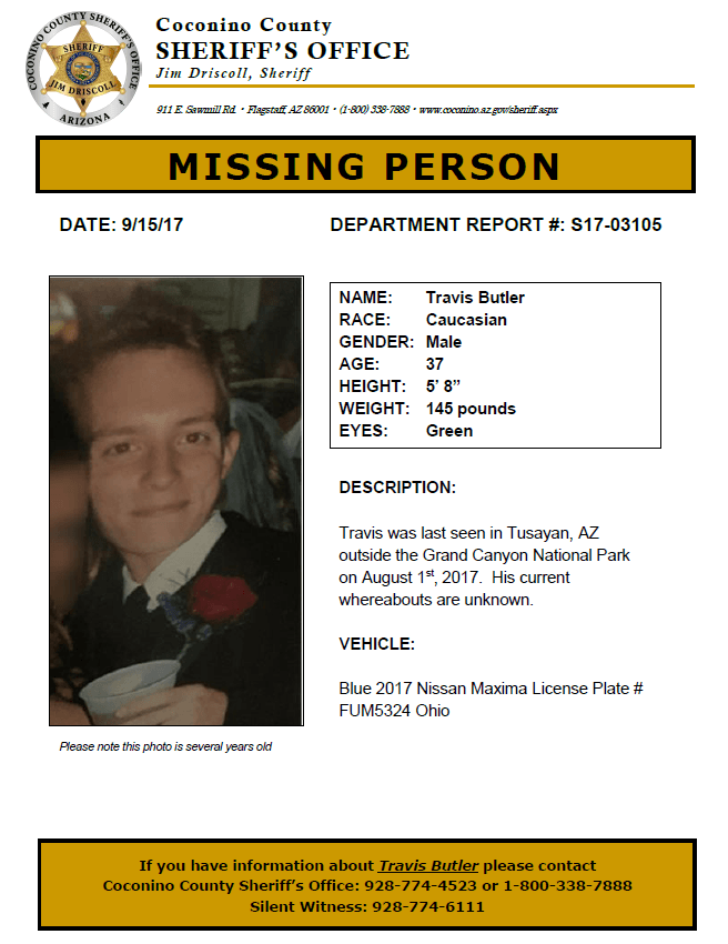 Missing Person Travis Butler - 37 years old, 5'8", 145 lbs, green eyes, brown hair. Travis failed to check out of a hotel outside of the Grand Canyon National Park on August 1, 2017. Vehicle associated with him may be a blue 2017 Nissan Maxima with Ohio license plate FUM5324. If you have any information, please contact the Coconino County Sheriff's Office at 1-800-338-7888 or Silent Witness 928-774-6111.