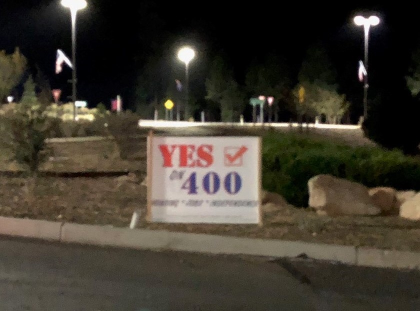 Both sides are also reminding voters to cast votes with road signs. The pro 400 crowd has apparently spent a tidy sum on professionally printed signs while those opposing prop 400 took a grass roots approach. The pro 400 side apparently forgot about ADOT right of way rules in posting signs along highway 64. It;s also worth noting that a number of councilmembers and P and Z commissioners are allowing pro 400 signs to be placed in front of properties they manage.